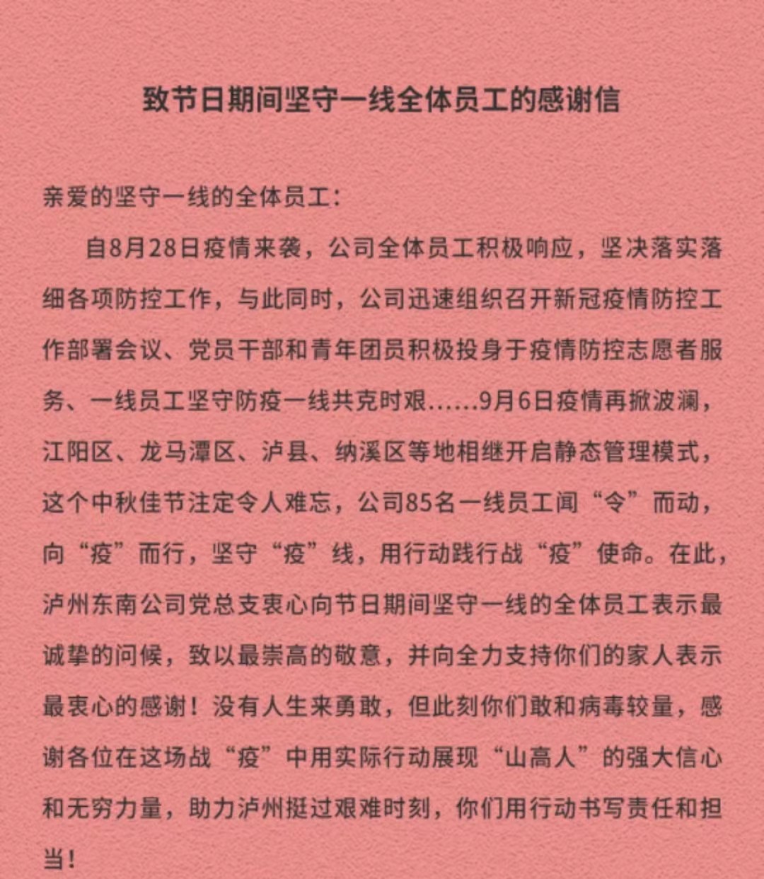 8月31日,泸州市龙马潭区应对新型冠状病毒肺炎疫情应急指挥部发布最新通告:明确自8月31日6时起对龙马潭区实行临时性静态管理。9月6日,泸州市龙马潭区、江阳区应对新型冠状病毒肺炎疫情应急指挥部相继发布最新通告:明确自9月7日6时起对龙马潭区、江阳区实行临时性静态管理,根据后续疫情形势和防控需要动态调整解除时间。截止9月15日,公司仍有67名员工封控居家办公,20名员工在公司机关驻守,63名员工在收费站、服务区一线驻守...